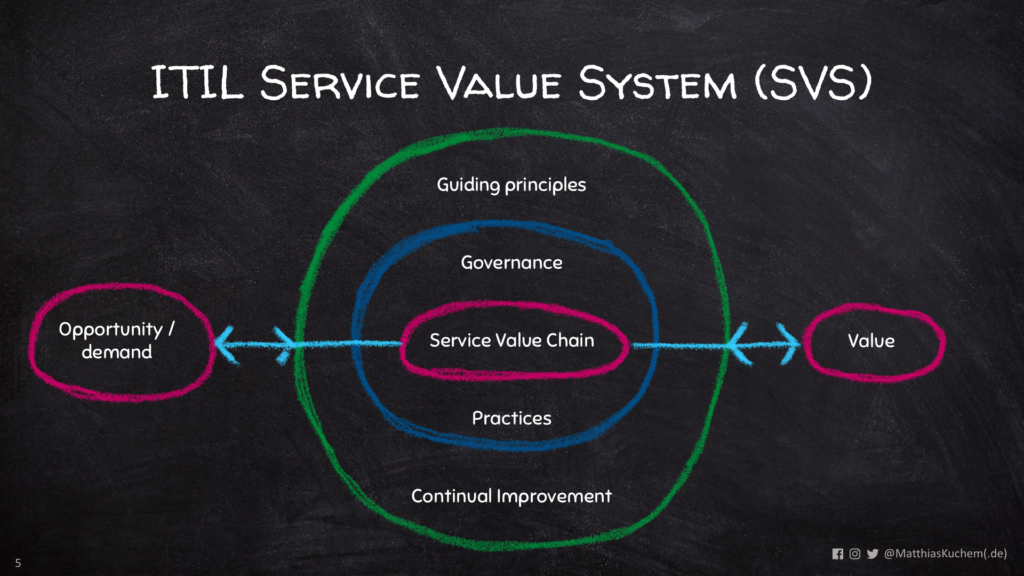 Das neue Grundgerüst von ITIL ist das Service Value System (SVS). Ausgehend von Opportunity und Demand wird von der Organisation Nutzen in Form von Services geliefert.